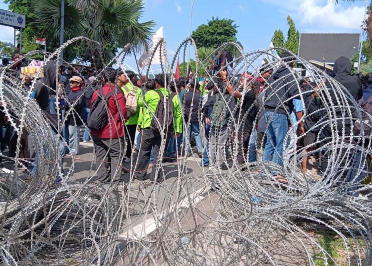 Infobenua.com Samarinda — Ribuan mahasiswa dan elemen masyarakat kembali menggelar aksi lanjutan di depan Kantor Gubernur Kalimantan Timur, Selasa (21/4/2026). Dalam aksi tersebut, massa sempat membuka paksa pagar kawat berduri yang dipasang sebagai barikade pengamanan.